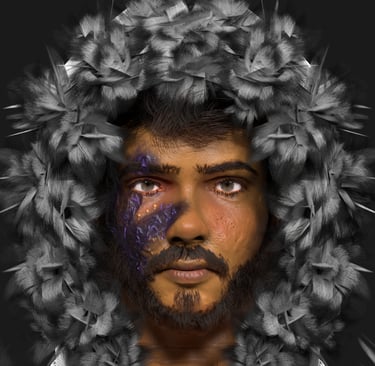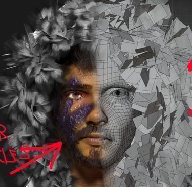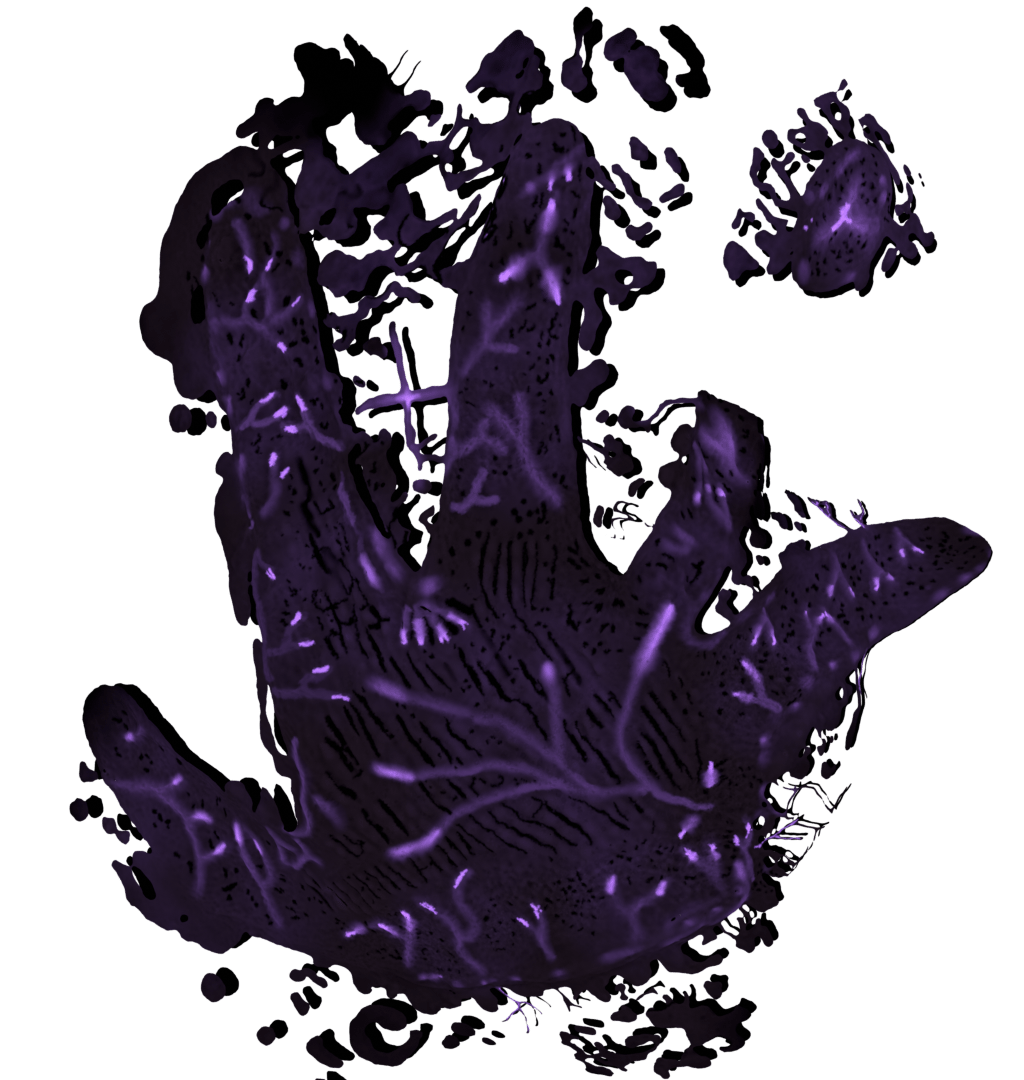 The stylized touch is reflected in his body, and will be reflected in the world around him.