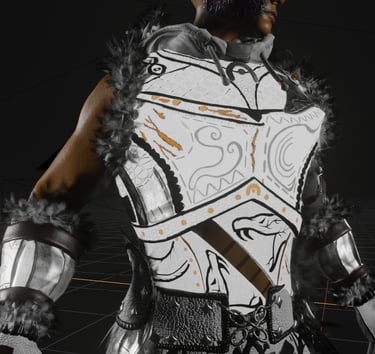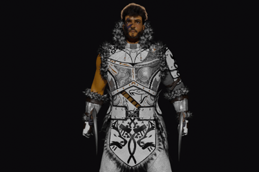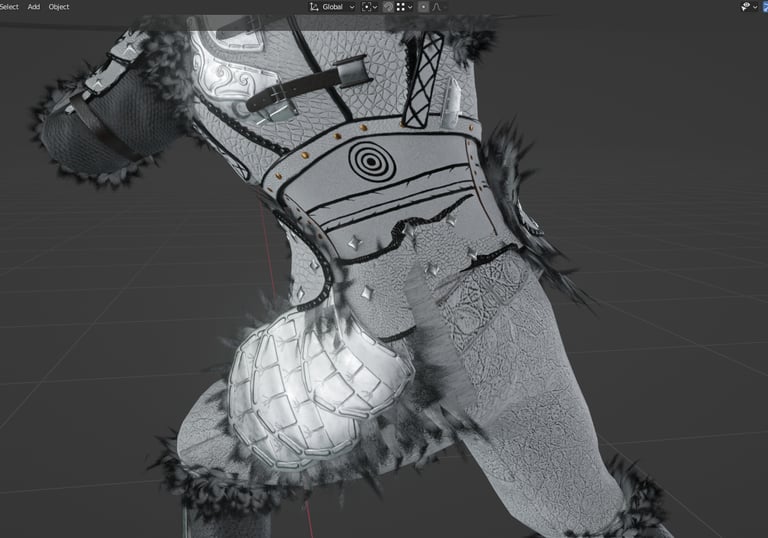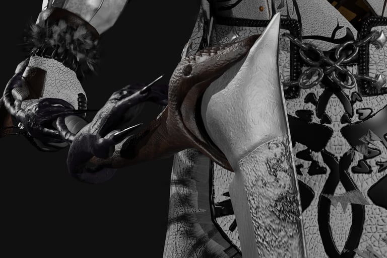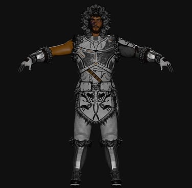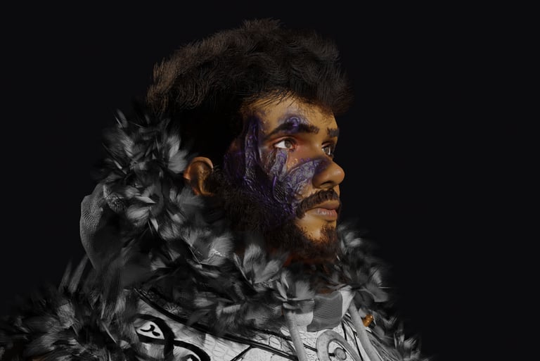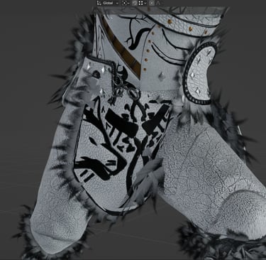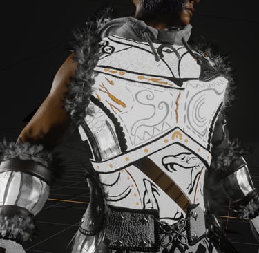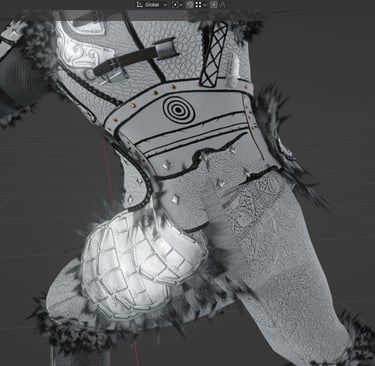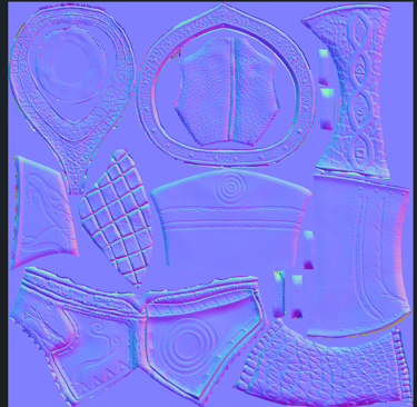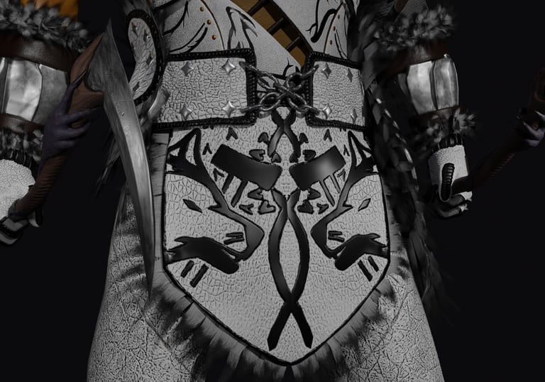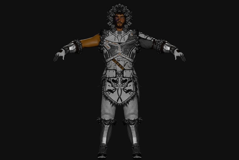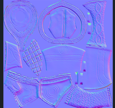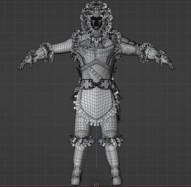 Every piece of cloth, armor, weapon the he carries is hand sculpted and hand textured. Procedural textures have been applied only to metallic parts and some leather pieces.